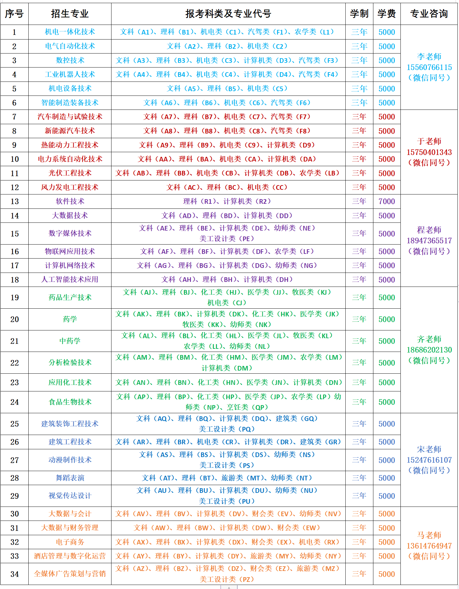 注:软件技术为校企合作高收费专业,学费7000元/学年